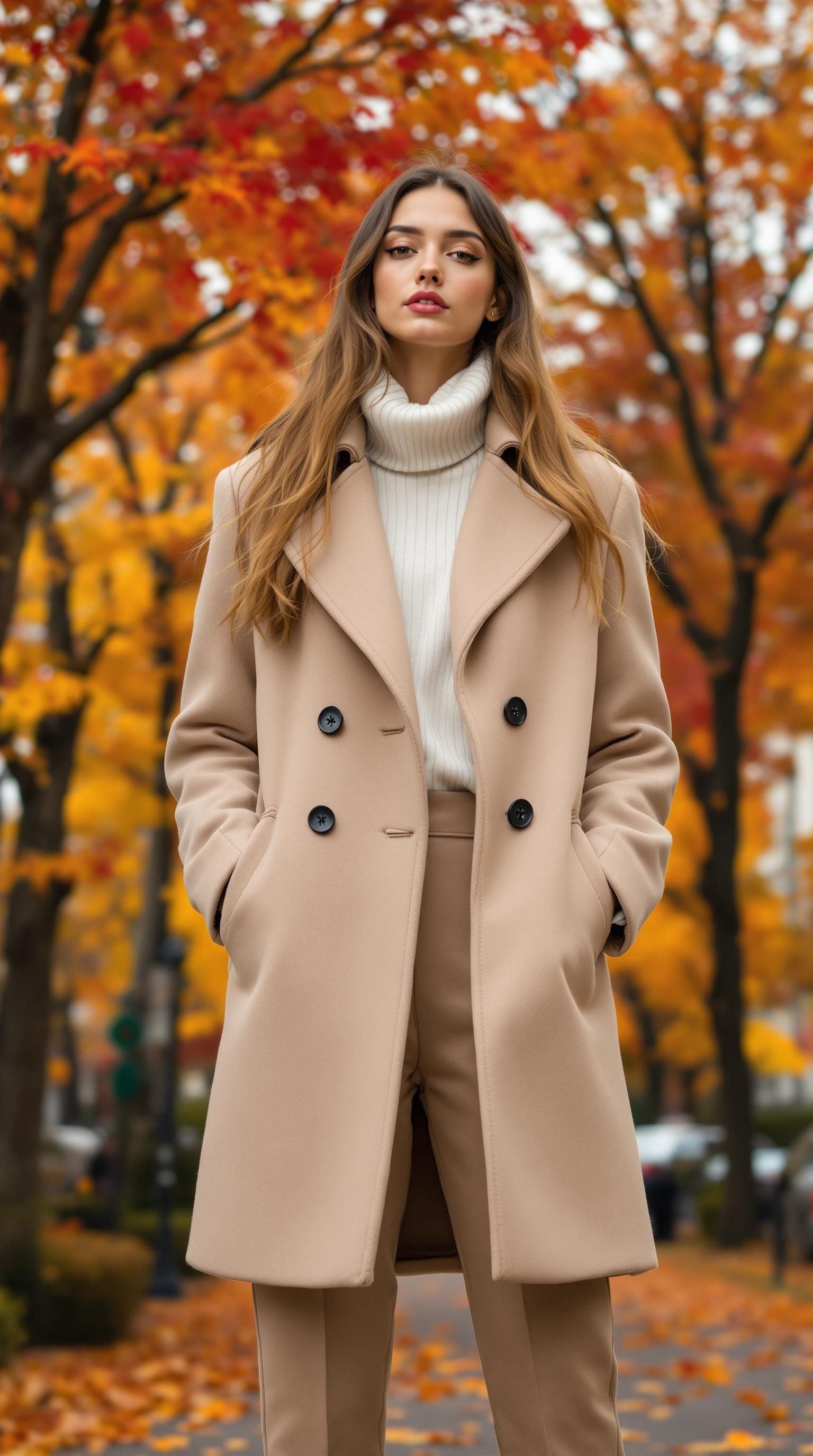 As the cooler months roll in, a warm wool coat becomes a wardrobe staple. This image captures a stylish look that perfectly combines comfort and sophistication. The model is dressed in a chic beige wool coat, featuring a classic double-breasted design that adds a touch of elegance.