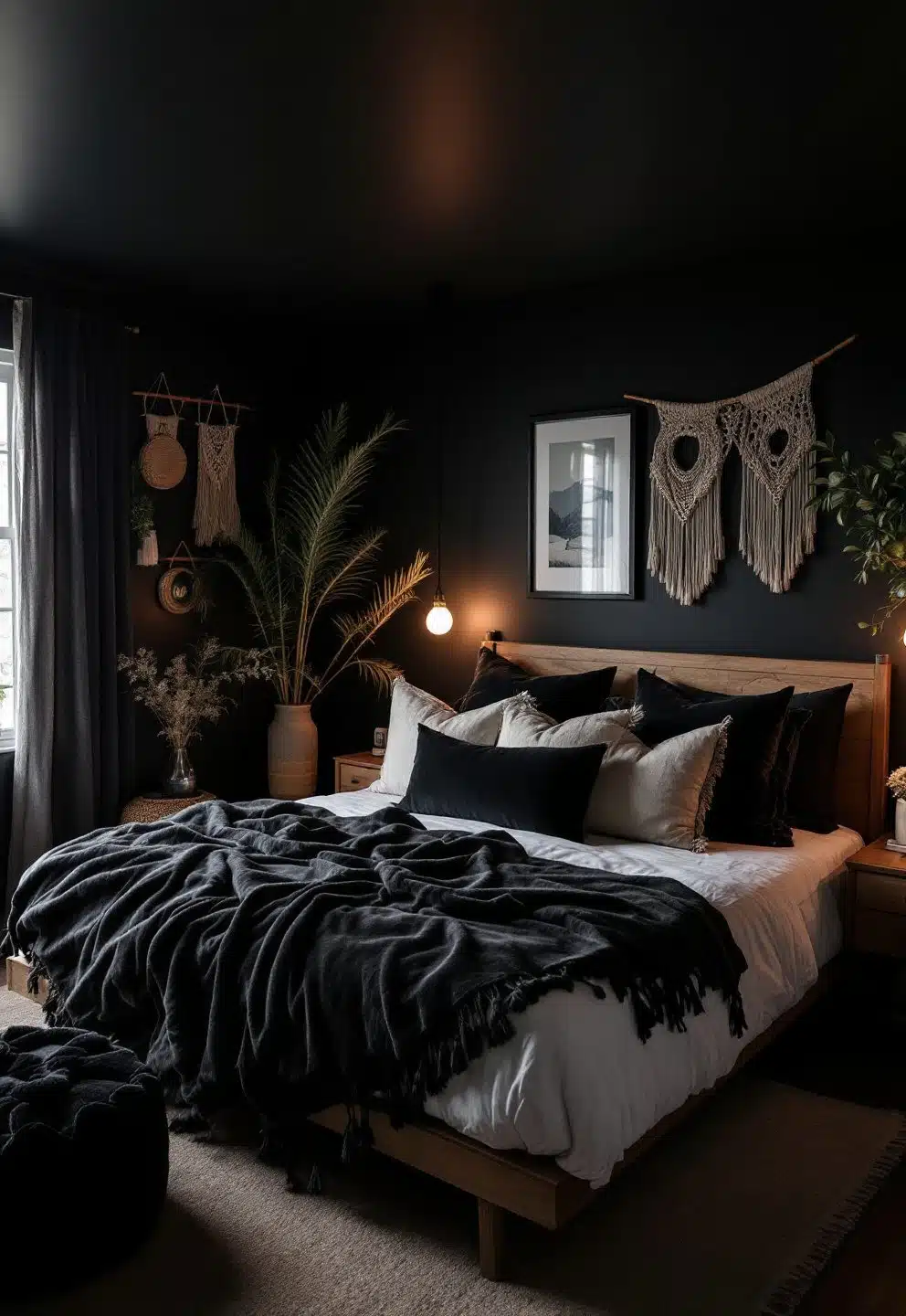 The use of plush black and charcoal textiles is pivotal in creating this sophisticated look. Layered velvet throws and oversized tassel pillows make the room feel inviting. Macramé wall hangings introduce a bohemian flair, and a large black-framed mirror adds visual intrigue and expands the space. To introduce warmth, deep wood tones from rustic pieces, like reclaimed wooden bedsides, complete the setting.