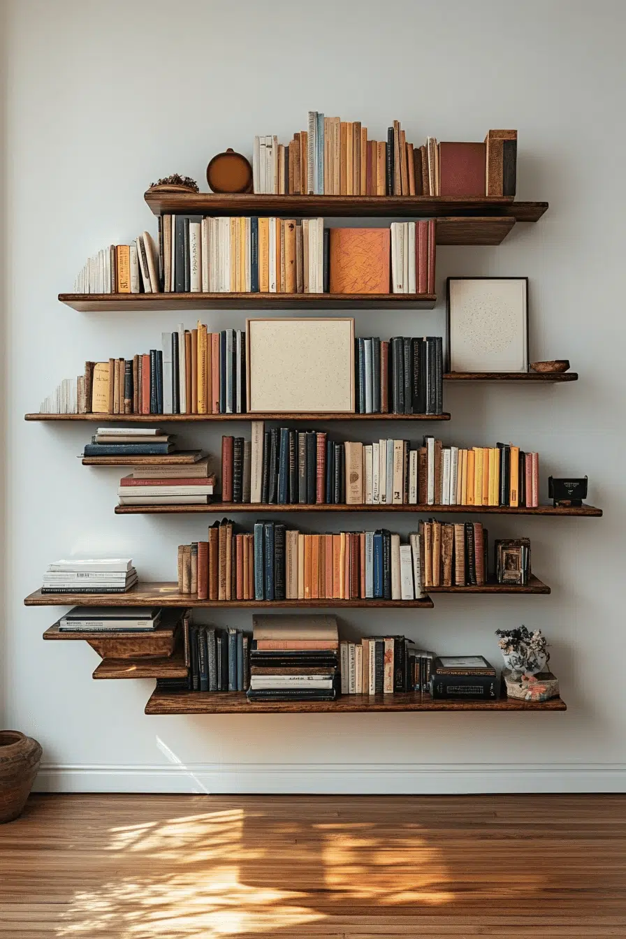 Minimal hardware creates maximum impact in invisible bookshelf ideas that let books take the spotlight. With supports hidden from view, the shelves create a striking floating illusion. This clean-lined approach is ideal for modern interiors and design-forward spaces. Grouping books by color or size enhances the visual effect even more. The overall look feels light, artistic, and contemporary.