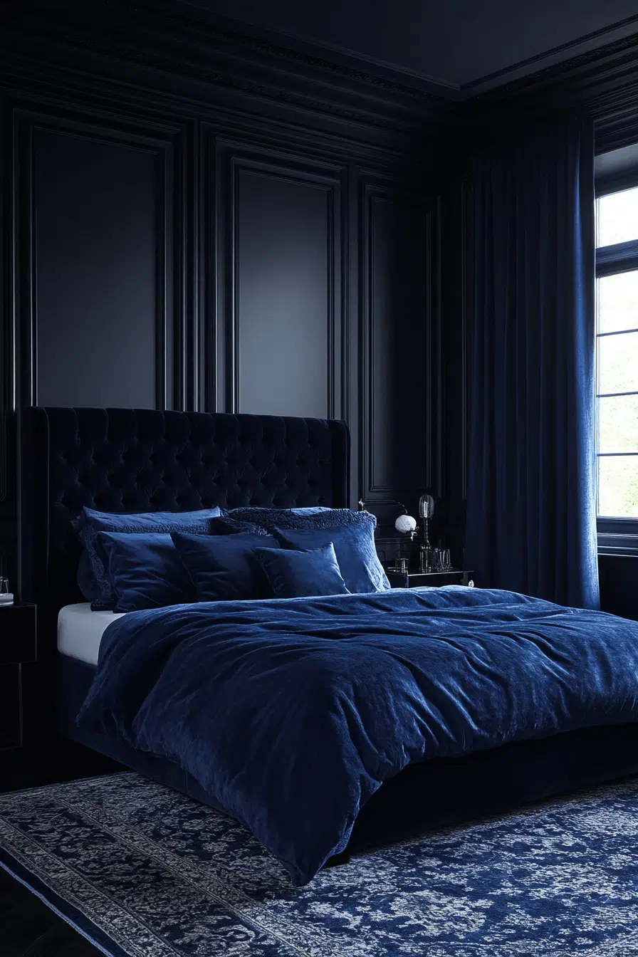 Design a peaceful dark feminine bedroom with deep blue tones that create celestial luxury. Navy walls paired with silver accents build sophisticated style without premium costs. Simple crystal elements enhance elegance while staying within budget.