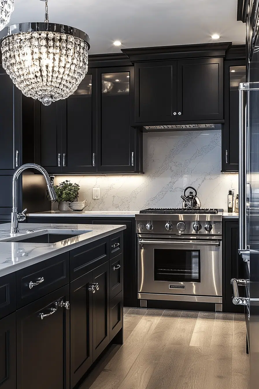 Deep black dark kitchen cabinets deliver a bold, luxurious statement that instantly elevates any kitchen space. Pairing them with gold or brass hardware creates a stunning contrast that feels high-end. Rich flooring and standout countertops complete the cohesive design. This look works especially well in larger kitchens where its impact can shine. The result feels powerful, elegant, and unforgettable. Explore new levels of luxury with these dark kitchen cabinets ideas.