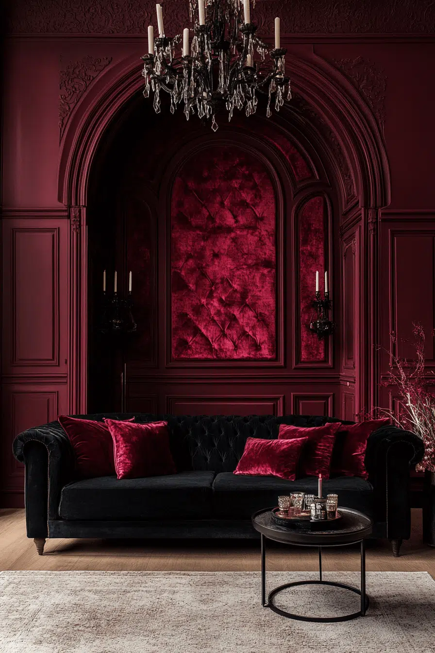 Pair dark maximalism with rich woods and plush fabrics for a warm, opulent boost. Velvet details and heavy textiles add grandeur without a big spend. It’s an easy way to wrap your room in elegance.