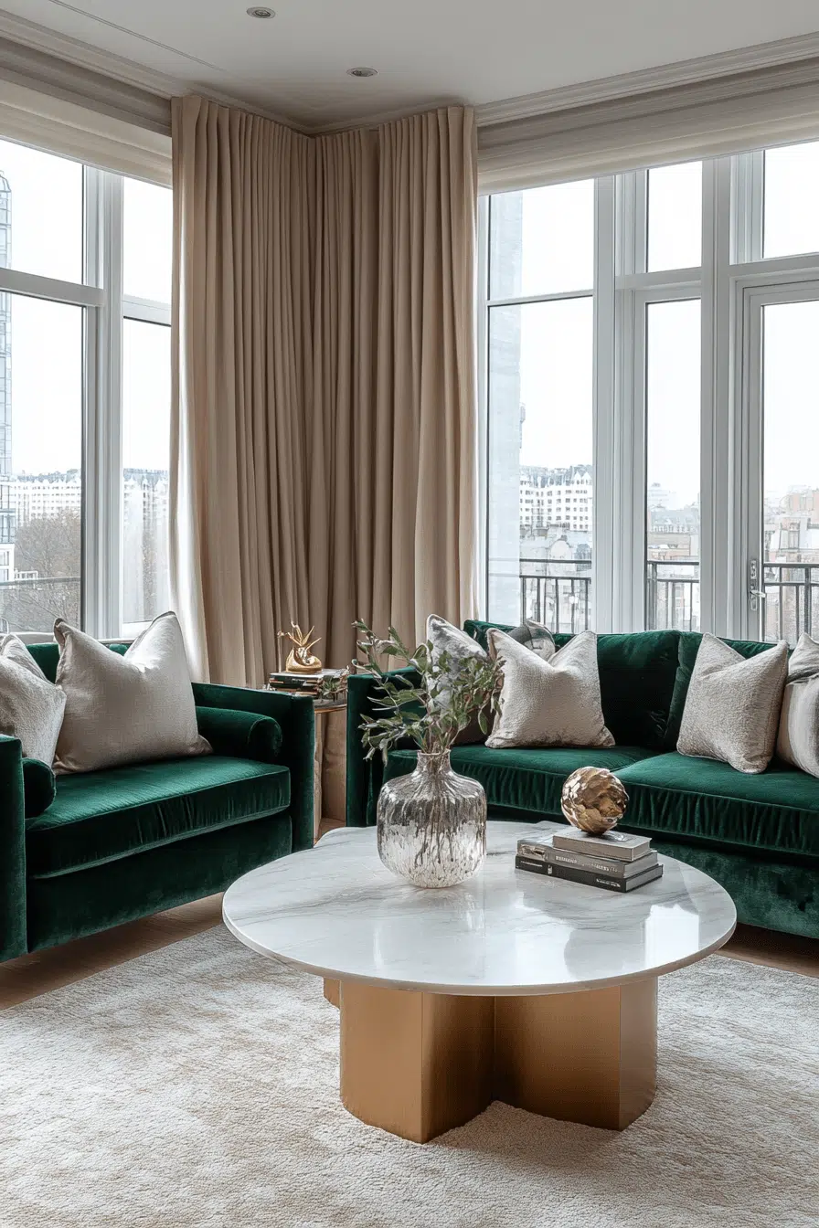 Blending modern shapes with rich materials creates a balanced elegant living room design that feels both current and timeless. Velvet, marble, and metal work together seamlessly. Thoughtful layouts prevent the space from feeling formal. Lighting enhances textures and depth. The result feels polished and inviting. Combine modern and classic elements effortlessly.