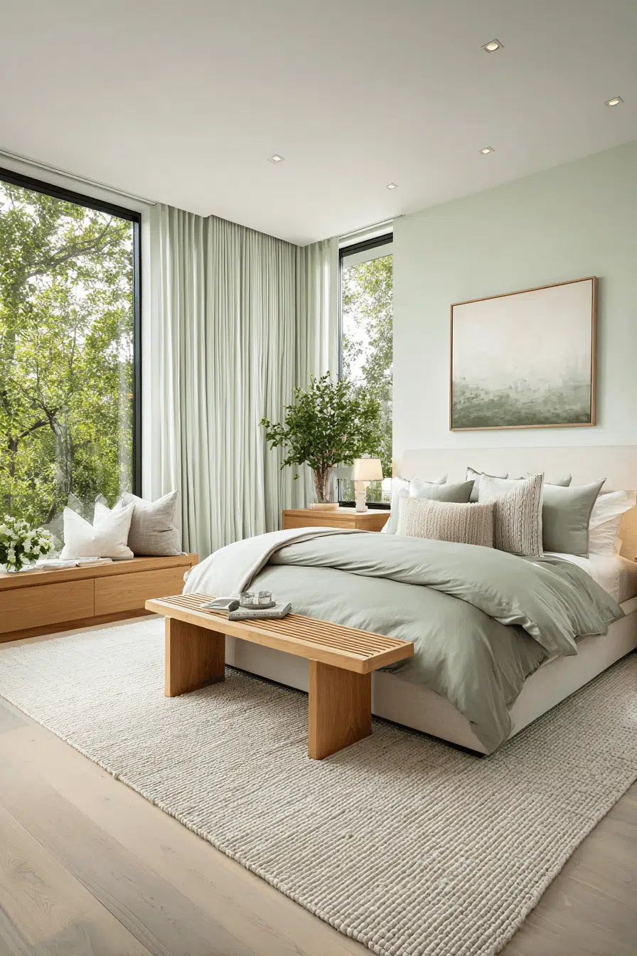 Light airy styling transforms a light sage green bedroom into a breezy, refreshing space that feels uplifting. Sheer curtains and neutral bedding enhance the open atmosphere. Light sage green bedroom tones add color without heaviness. Soft wood finishes keep everything grounded. The space feels fresh and relaxed. Brighten your bedroom with this airy approach.