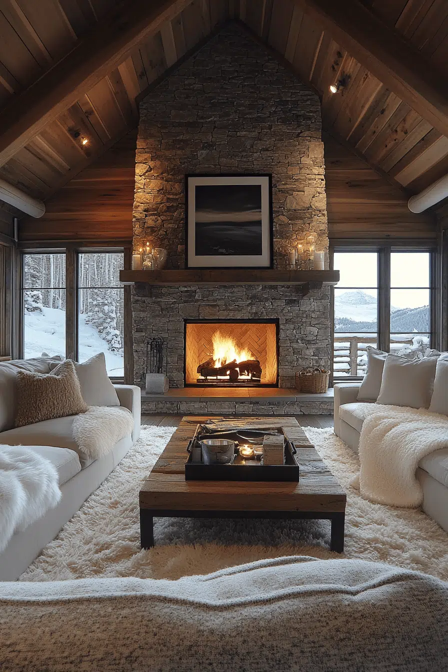 Natural stone creates a romantic focal point in this hearth-centered little cabin living room. The fireplace anchors the space with warmth and texture. Plush seating completes the cozy arrangement. The mood feels intimate and glowing. It’s perfect for quiet evenings.
