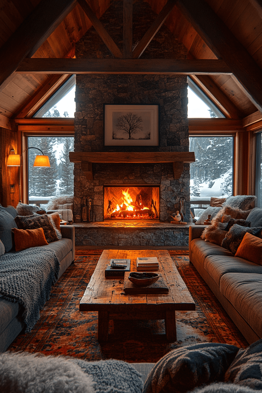Snow gently falls outside while this little cabin living room radiates winter magic. Fuzzy throws, soft lighting, and a crackling fireplace make it feel like a dream come true. The textures and tones capture warmth against the chill. Every moment here feels peaceful and restorative.