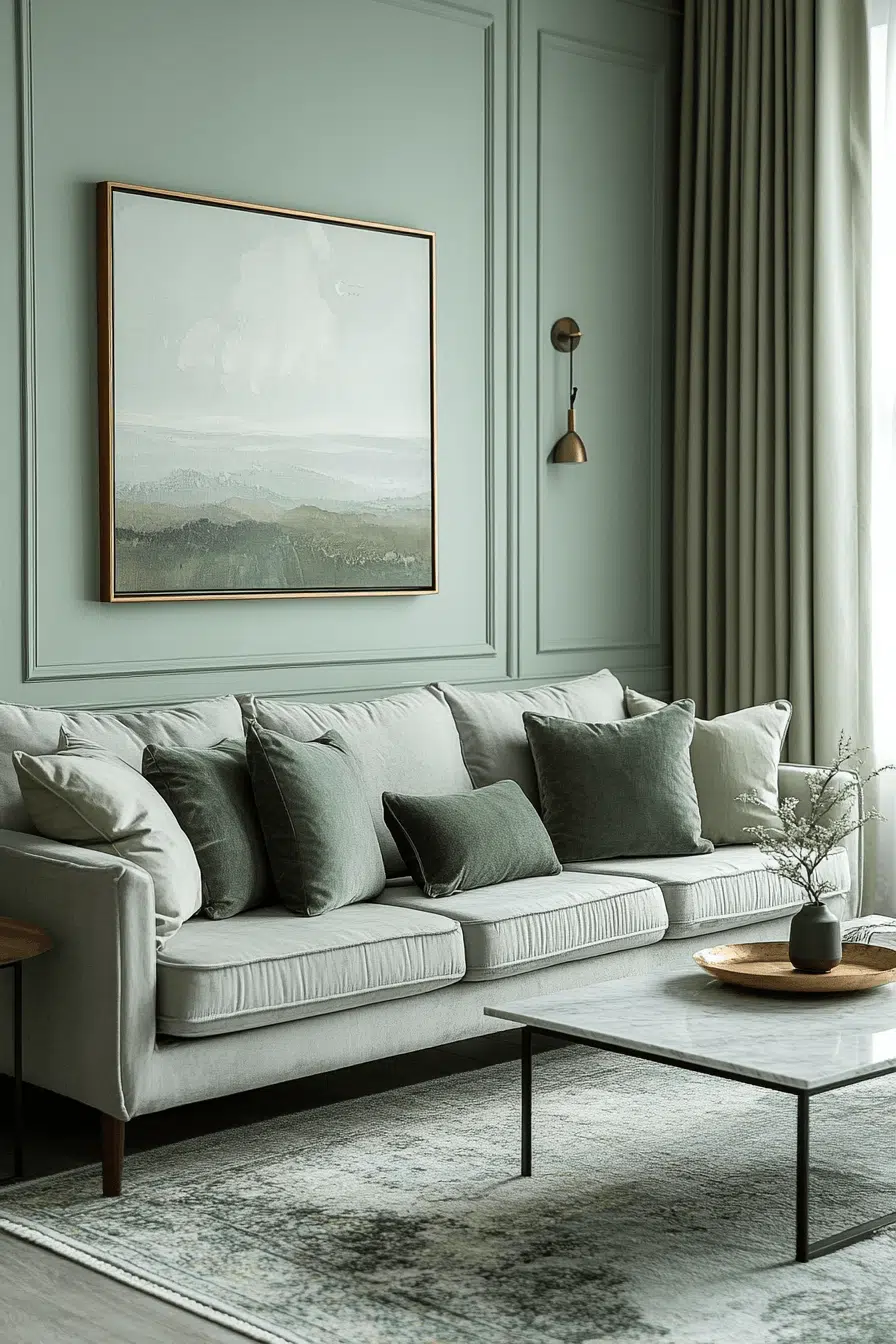 Graceful details can make this palette feel especially refined and adaptable. A sage green and grey living room becomes elegant when soft grey walls, sage furnishings, and layered lighting are combined with subtle glass, metallic, or textured accents. Each finish adds depth without overwhelming the room. The palette works beautifully in both minimal and more elevated interiors. The space feels cohesive, calm, and quietly luxurious. Discover this graceful color story and elevate your living room effortlessly.