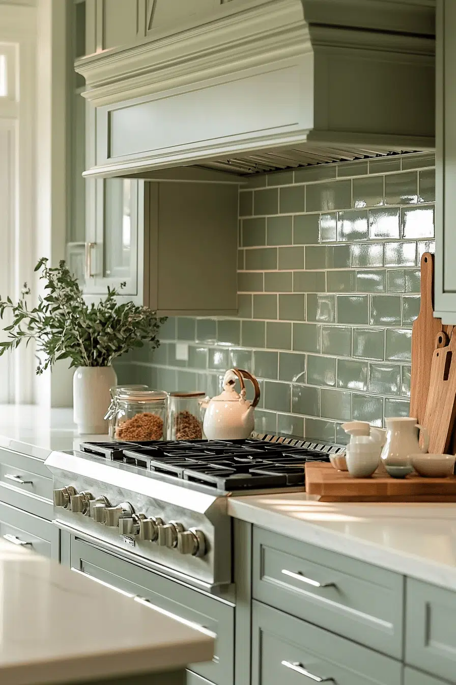 Glass surfaces can bring extra light to a room that needs a little more glow. A sage green backsplash kitchen feels brighter when glossy glass tile catches and reflects light across the wall. The gentle shine enhances the sage tone while keeping it soft and elegant. This approach is especially helpful in smaller or darker kitchens that benefit from a more open feel. The final space looks polished, airy, and elevated. Use glass tile in sage and let your kitchen feel more luminous.