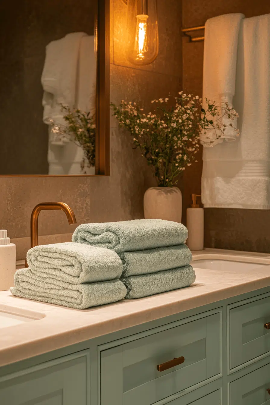A lived-in feeling can make modern design feel much more inviting. Sage green bathroom decor helps sleek spaces feel warmer when plush towels, soft textures, and gentle lighting are layered in thoughtfully. The green adds a welcoming softness that keeps the room from feeling too sharp. The overall design stays contemporary but gains comfort and warmth. It becomes a space you actually want to spend time in. Make your bathroom feel more inviting with this cozy approach.