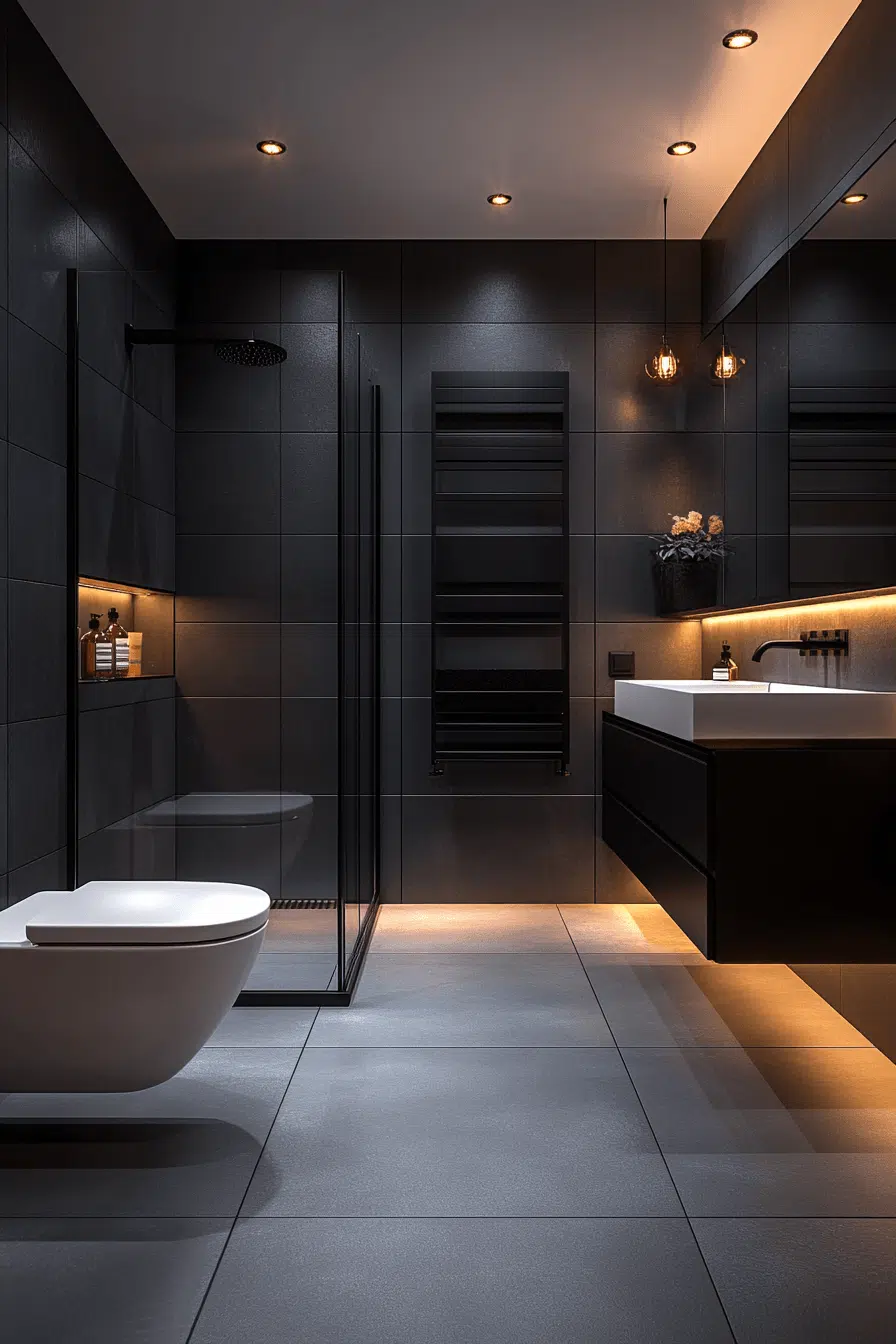 Dark stone can feel dramatic and luxurious when balanced the right way. These small bathroom tile ideas use black slate to bring depth, texture, and sophistication into a compact room. Lighter sinks, walls, or fixtures keep the design from feeling too heavy. Warm lighting helps reveal the richness of the stone and gives the room a cozy upscale edge. The result is bold, grounded, and very stylish. Use black slate and give your bathroom a striking new mood.