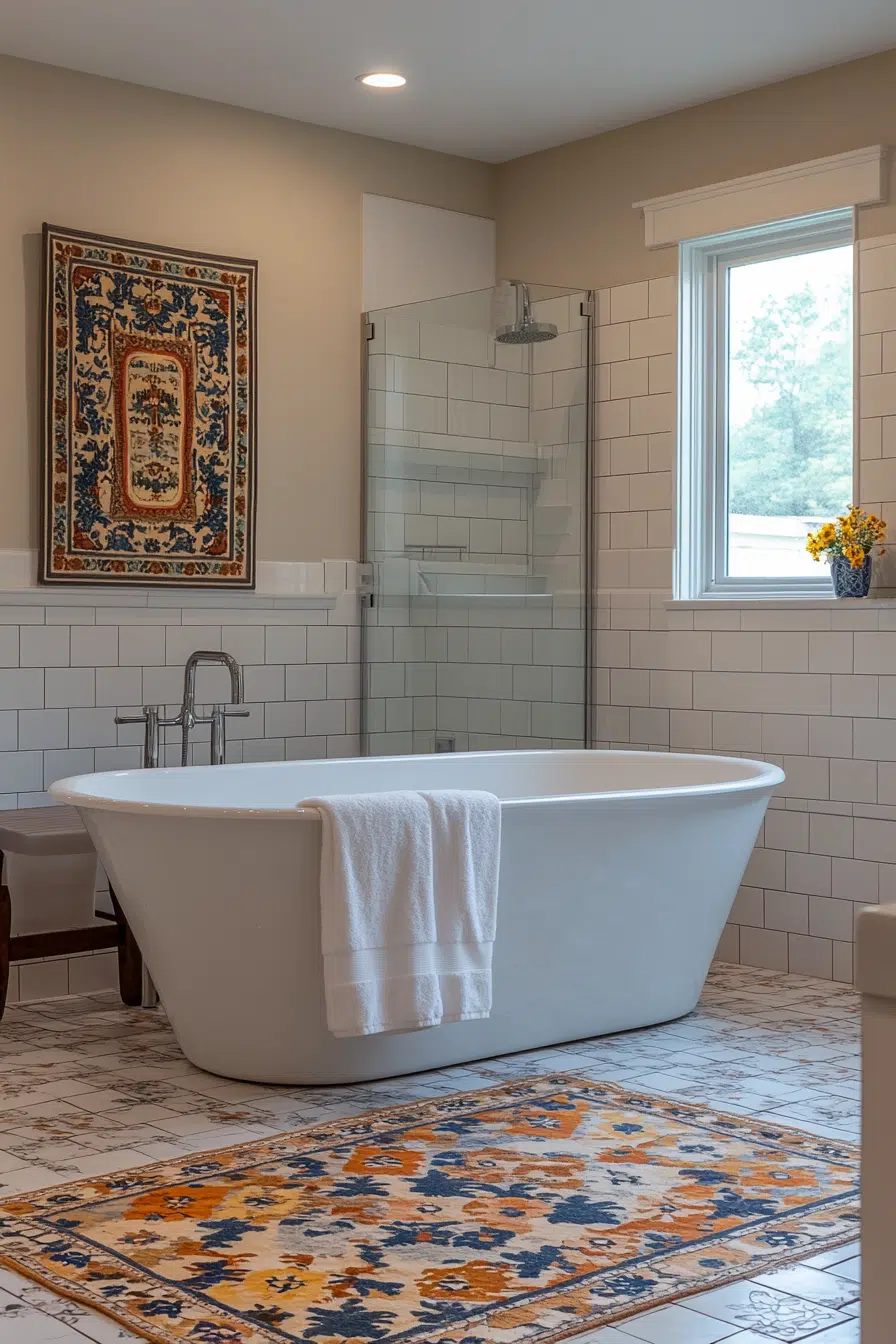 Playful Retro-Inspired Bath: Bright colors and bold patterns bring energy to a vintage modern master bath, blending retro flair with sleek modern designs. This vibrant space is perfect for those who love bold, fun style.