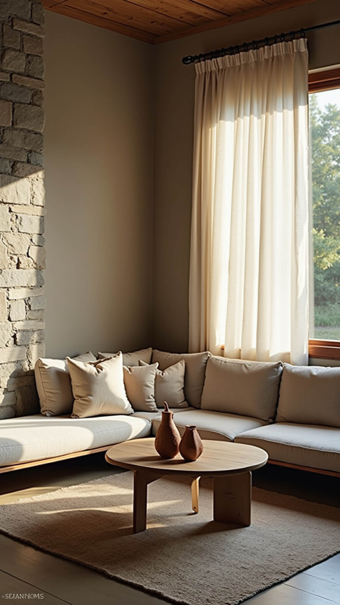 Sunlit Wabi Sabi living room with stone accent wall, handcrafted wooden coffee table, oak frame sofa with wool cushions, and clay pottery in warm grey and beige tones.