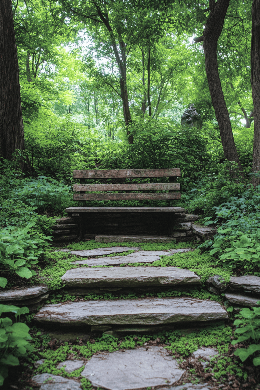 Filtered light dances through leaves in this peaceful wabi sabi garden retreat. The canopy above casts gentle shade over a landscape of green. Every flicker of sunlight feels sacred. It’s serenity wrapped in nature’s embrace.