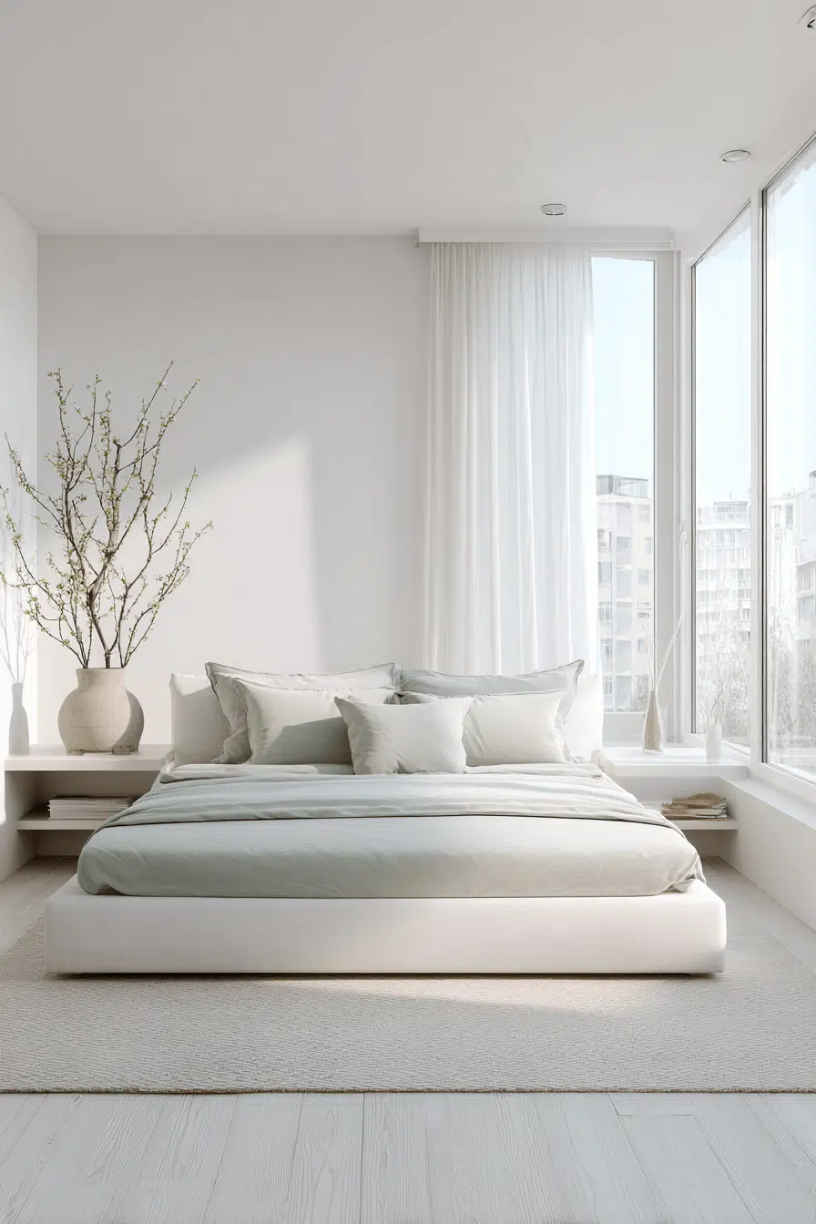 Minimal design brings a sense of calm to a white and sage green bedroom while keeping the space open and effortlessly stylish. Crisp white walls reflect light beautifully as soft sage accents introduce a gentle, nature-inspired feel. Clean furniture and smart storage keep everything uncluttered and easy to enjoy. Natural light enhances the airy atmosphere throughout the room. The balance between tones feels both modern and timeless. Create your own peaceful bedroom by embracing this simple and refined style.
